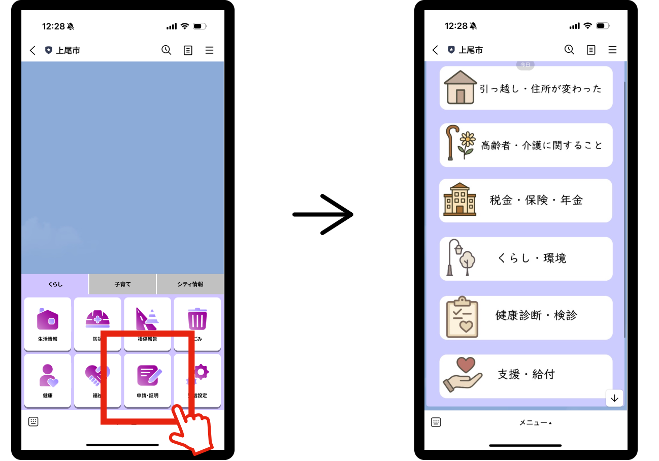 リッチメニュー「電子申請」をタップすると、利用可能な申請のメニューが表示されます。
