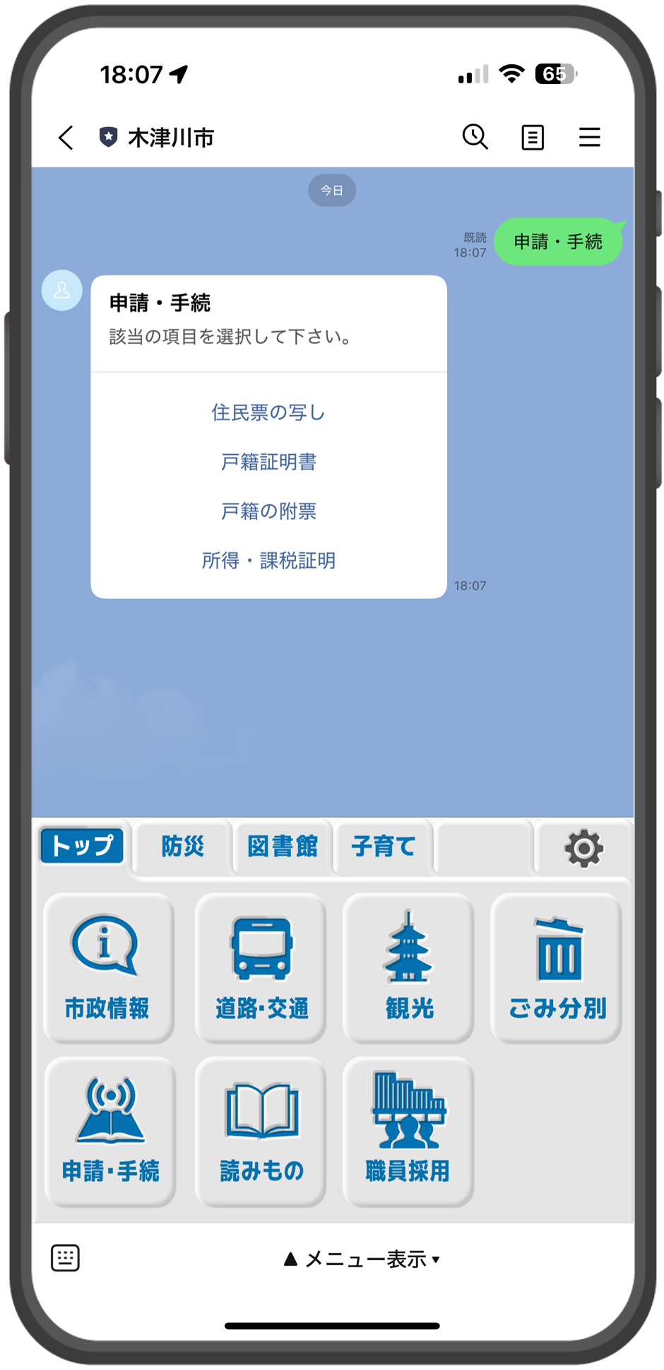 LINE公式アカウントから手続きを行いますので、LINEアプリをインストールしてユーザー登録を行ってください。